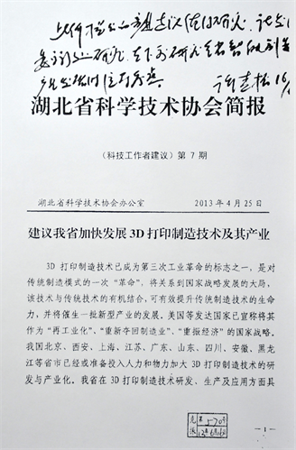 经与省科协有关部门领导多次商议和建议稿起草人多次修改,4月25日,湖北省科协以湖北省科学技术协会简报(科技工作者建议)第7期,《建议我省加快发展3D打印制造技术及其产业》的建议稿上报省委省政府及其有关部门。
