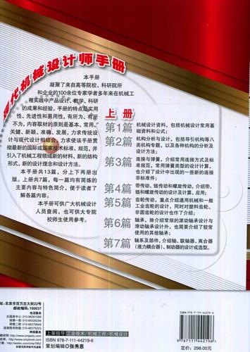《现代机械设计师手册》共13篇,分上下两册。上册共7篇:第1篇 机械设计资料,第2篇 机构分析与设计,第3篇 联接与弹簧,第4篇 带、链和螺旋传动,第5篇 齿轮传动,第6篇 轴承,第7篇 轴系及部件。