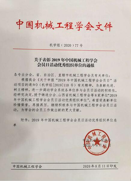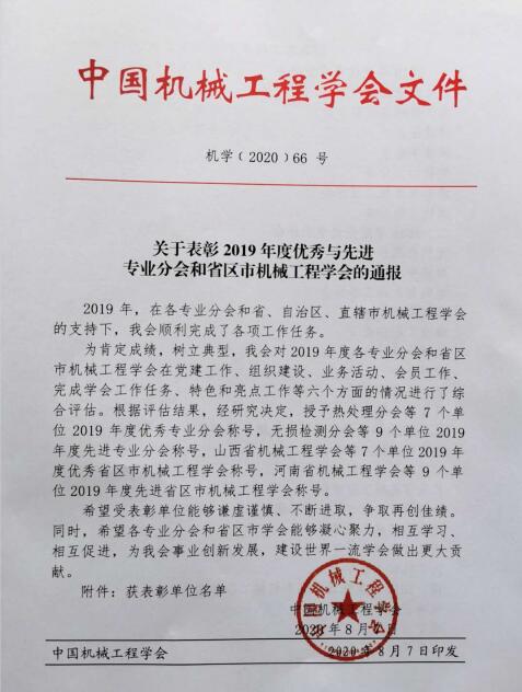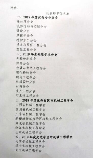 中国机械工程学会(CMES)召开表彰大会,表彰2019年度优秀与先进专业分会和省区市机械工程学会。