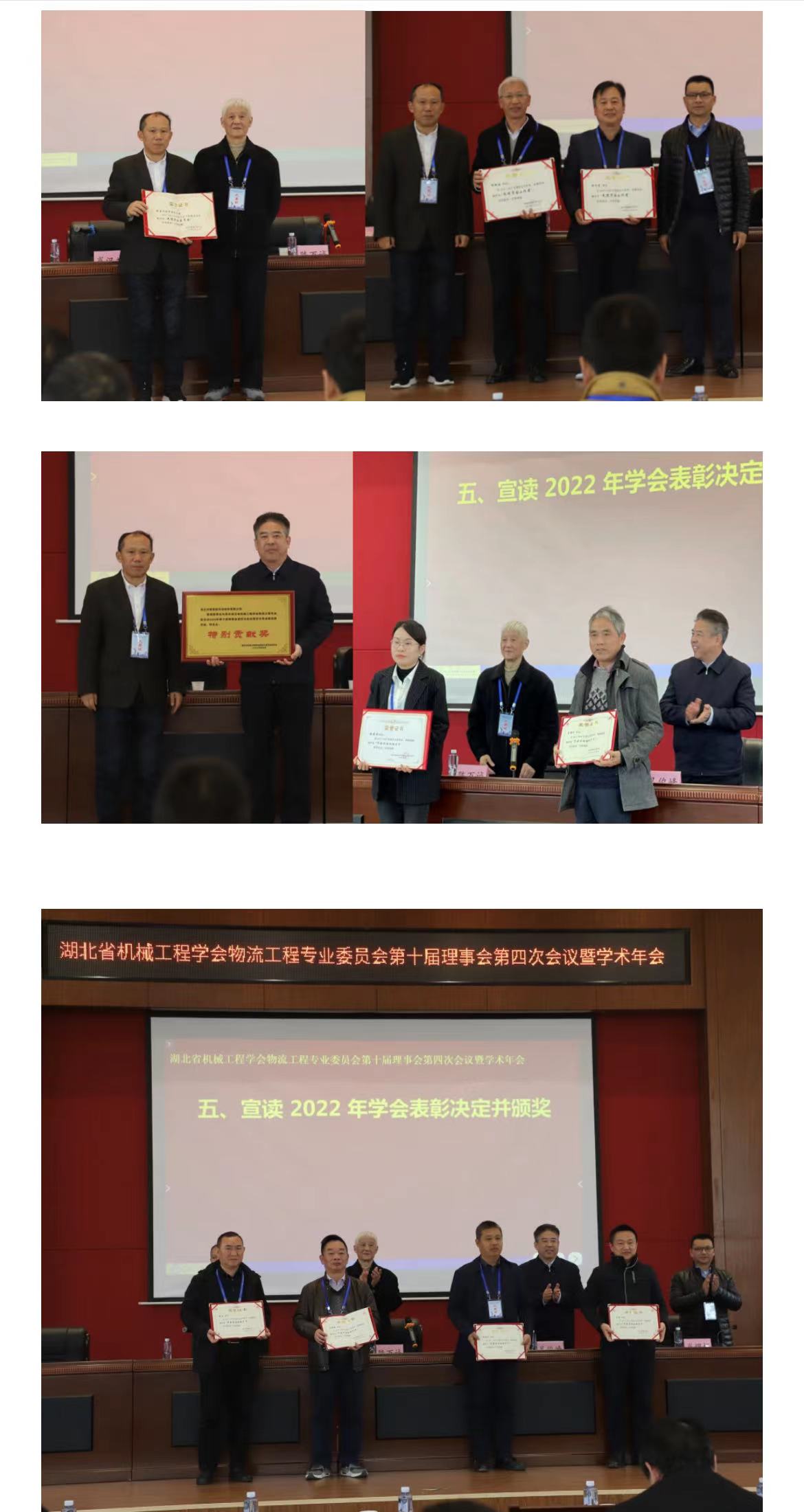 年度工作报告后,专委会秘书长曹小华宣读了2022年湖北省机械工程学会表彰决定并举行了颁奖仪式。学会授予物流工程专业委员会“先进专业委员会”荣誉称号,授予湖北科峰智能传动股份有限公司“特别贡献奖”,授予武汉理工大学肖汉斌同志“学会特别贡献奖”荣誉称号,授予武汉理工大学邵新建同志和湖北三六重工有限公司周冬青同志“学会先进工作者”荣誉称号,授予湖北佳恒科技股份有限公司金波同志,武汉港博港机技术有限公司佘黎明同志,湖北三六重工有限公司赵群同志,宜都华迅智能输送股份有限公司宋红玖同志,武汉科技大学王勇教授,武汉理工大学吴洪明副教授,湖北鄂南起重运输机械有限公司李耀成同志,中国五环工程有限公司魏婷婷同志 “学会活动积极分子”荣誉称号。