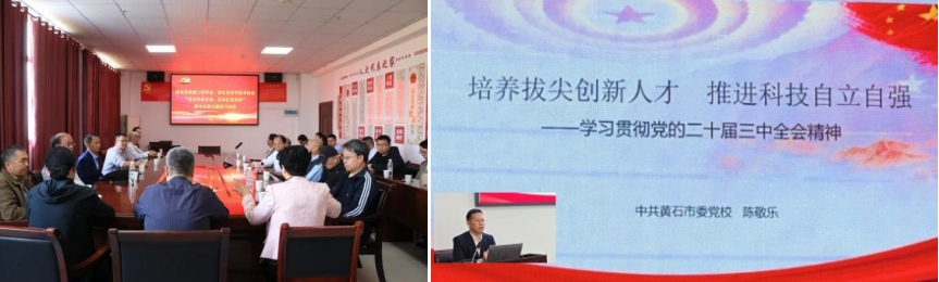 黄石市委党校党史党建教研室主任陈敬乐给党员同志们作《培养拔尖创新人才 推进科技自立自强——学习贯彻党的二十届三中全会精神》的党课。党课围绕深刻领会二十届三中全会的背景与意义、准确把握全会精神的重要部署,科技创新、肩负使命,勇于奉献,敢于担当,党的二十届三中全会精神的重大意义。将全会精神与实际工作深度融合,在实现中国式现代化道路上,为祖国繁荣昌盛贡献新的力量。