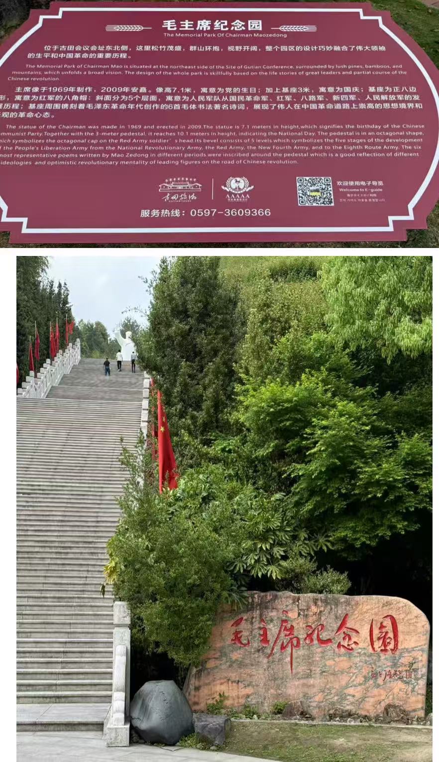 古田会议会址东北侧的毛主席纪念园可以让我们缅怀毛主席的丰功伟绩、了解他波澜壮阔一生的圣地。毛主席纪念园是2009年古田会议胜利召开80周年之际,当地百姓和政府为了表达对毛主席的感激和怀念之情选址修建的。