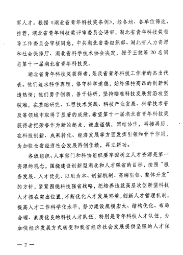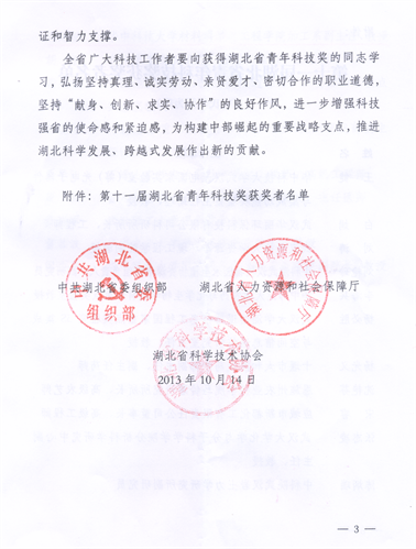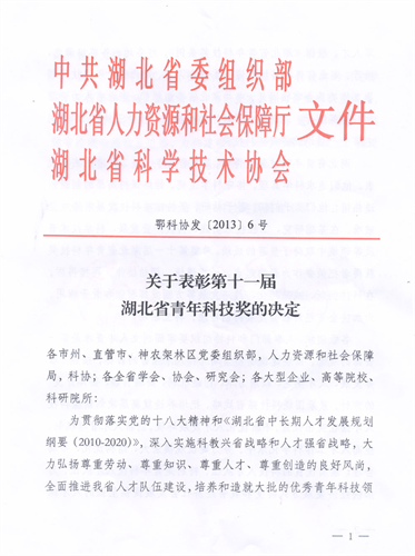 根据中共湖北省委组织部、湖北省人社厅、湖北省科协鄂科协发[2013]6号文件,《关于表彰第十一届湖北省青年科技奖的决定》,我会铸造专业委员会秘书长、华中科技大学材料科学与工程学院教授周建新荣获第十一届湖北省青年科技奖。该奖项每两年表彰一次,每次表彰不超过20人。