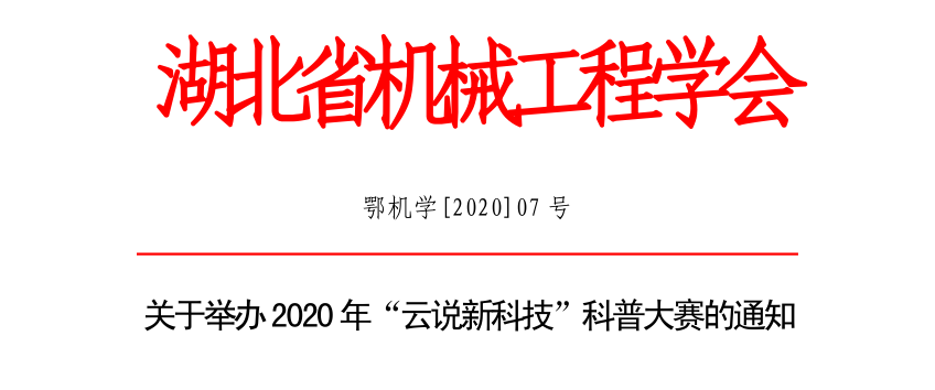 根据中国机械工程学会《关于举办2020年“云说新科技”科普大赛通知》精神,经湖北省机械工程学会和大赛组委会批准, 2020年“云说新科技”科普大赛(湖北区域试点工作)将于2020年下半年举行,现发布通知如下:
