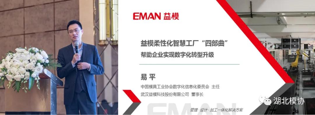 武汉益模科技股份有限公司董事长易平博士(兼任中国模协数信委主任委员),作了《益模柔性化智慧工厂四部曲帮助企业实现数字化转型升级》报告。易博士分析了世界模具国家能力排名并指出,中国模具行业目前在市场规模方面已经达到了世界顶尖地位,但是在生产能力、产品质量等综合竞争力上,与德国为代表的工业发达国家相比还存在一定差距,主要表现在国内模具行业生产管控运营水平不足、国内模具企业效率低效益差人才后备不足。针对这些痛点,益模提出了并联式的发展道路——柔性化智慧工厂发展路径。在实现柔性化智慧工厂的道路上,益模结合十几年的信息化经验以及德国工业4.0、中国制造2025的指引,制定出了并联式发展道路!整个过程可分为数字化透明工厂、自动化高效工厂、精益化高效益工厂及基于工业互联网/5G/AI等技术的未来工厂四部曲。