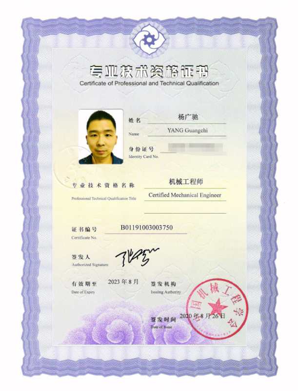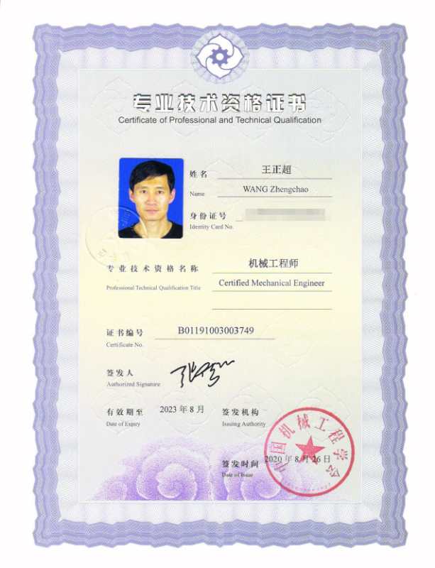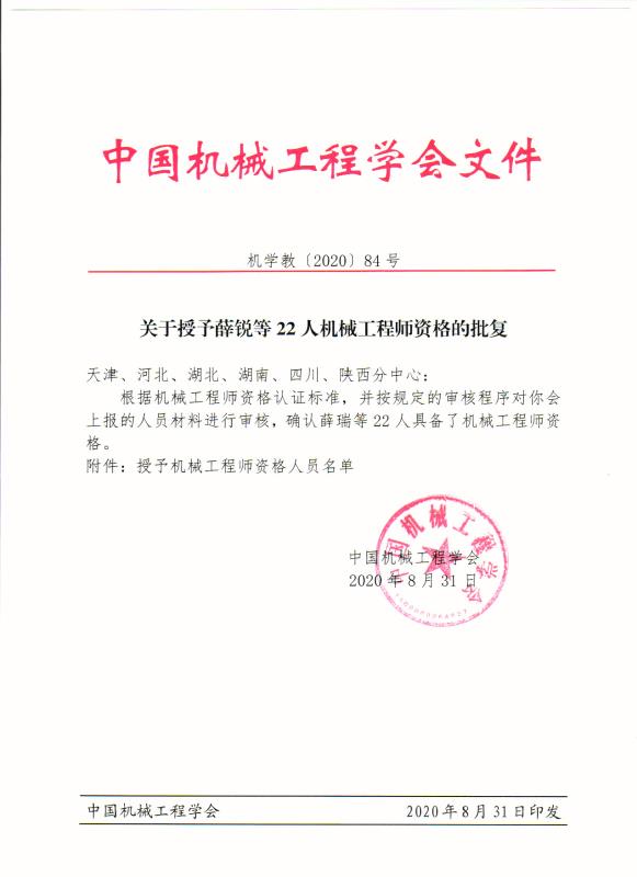 我会6位考试合格人员获得总会颁发的“机械工程师专业资格证书”