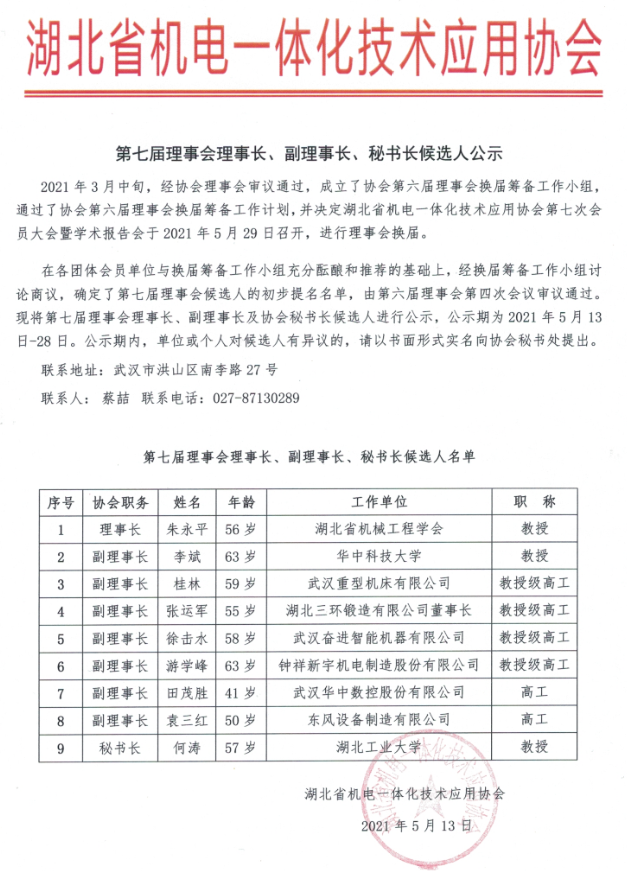 湖北省机电一体化技术应用协会第七届理事会理事长、副理事长、秘书长候选人公示