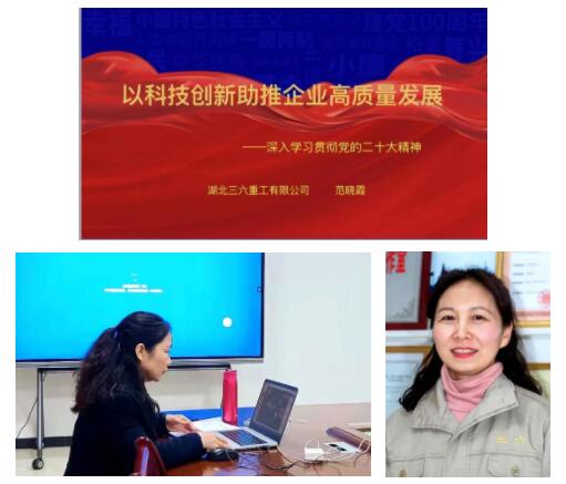 会议首先特邀中共二十大代表范晓霞讲党课。湖北三六重工有限公司技术中心副主任范晓霞是湖北省出席中共二十大的63名代表之一。她报告的题目是“以科技创新助推企业高质量发展”。她生动地介绍了湖北代表团参加二十大党代会的细节和我省来自基层党代表的杰出贡献。详细宣讲和解读了二十大报告的主要内容。介绍了大会盛况和湖北省代表团的基本情况,详细介绍了大会主题和习近平总书记报告的15个部分,并对每一部分做了详细解读。她还介绍了湖北代表的部分代表团畅谈科技创新,推动高质量发展的发言内容,她说:只有始终坚持科技创新,努力承担更多的重大科技项目攻关,取得更多的科学技术创新成果,才能帮助企业不断发展壮大,让产品走出湖北、走向世界。中国式现代化、民族复兴的伟大事业需要肯钻研、能创新的时代新人。广大青年恪守科学精神,勇做创新先锋,在平凡的岗位上成就不平凡的事业。