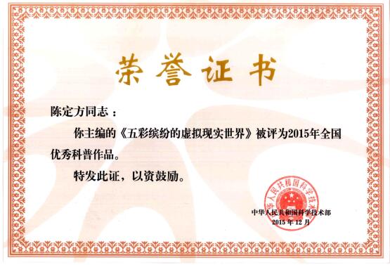 2015年4月中国水利水电出版社出版发行科普著作《五彩缤纷的虚拟现实世界》(书号ISBN:9787517027737),是由机械设计与传动专委会荣誉理事长陈定方教授主编。该书获得科技部2015年全国优秀科普作品奖、2016年中国科普作家协会优秀作品奖银奖。