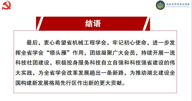 孙击翔副主席提到,湖北省机械工程学会开展的一系列工作在推动我省科技经济融合发展方面取得了阶段性成果,他要求学会积极参与省科协今年重点打造的“院士专家荆楚行”品牌活动,根据地方实际需求,分领域、分类型组织开展精准对接活动,推动创新链与产业链相结合,再出新招、再立新功。他衷心希望学会进一步发挥全省学会“领头雁”作用,团结凝聚广大会员,持续开展一流科技社团建设,积极投身服务科技自立自强和科技强省建设的伟大实践,为全省学会改革发展蹚出一条新路,为推动湖北建设全国构建新发展格局先行区作出新的更大贡献。