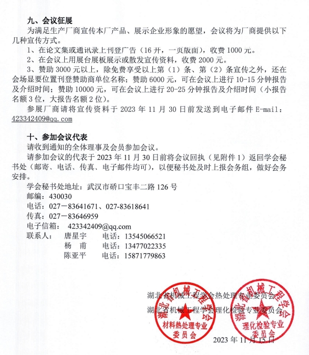 2023年湖北省机械工程学会材料热处理与理化检验专业委员会学术交流会暨材料热处理专业委员会成立六十周年报告会定于2023年12月14-16日在武汉欧亚会展国际酒店召开。