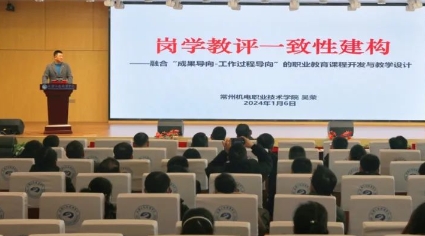 全国机械行指委服务型制造技术专指委副主任委员、常州机电职业技术学院教务处处长吴荣以《“岗学教评”一致性建构——融合“成果导向-工作过程导向”的职业教育课程开发与教学设计》为题作学术报告。围绕成果导向、工作过程导向的课程设计开展论述,提出岗学教评一致性建构新模式。