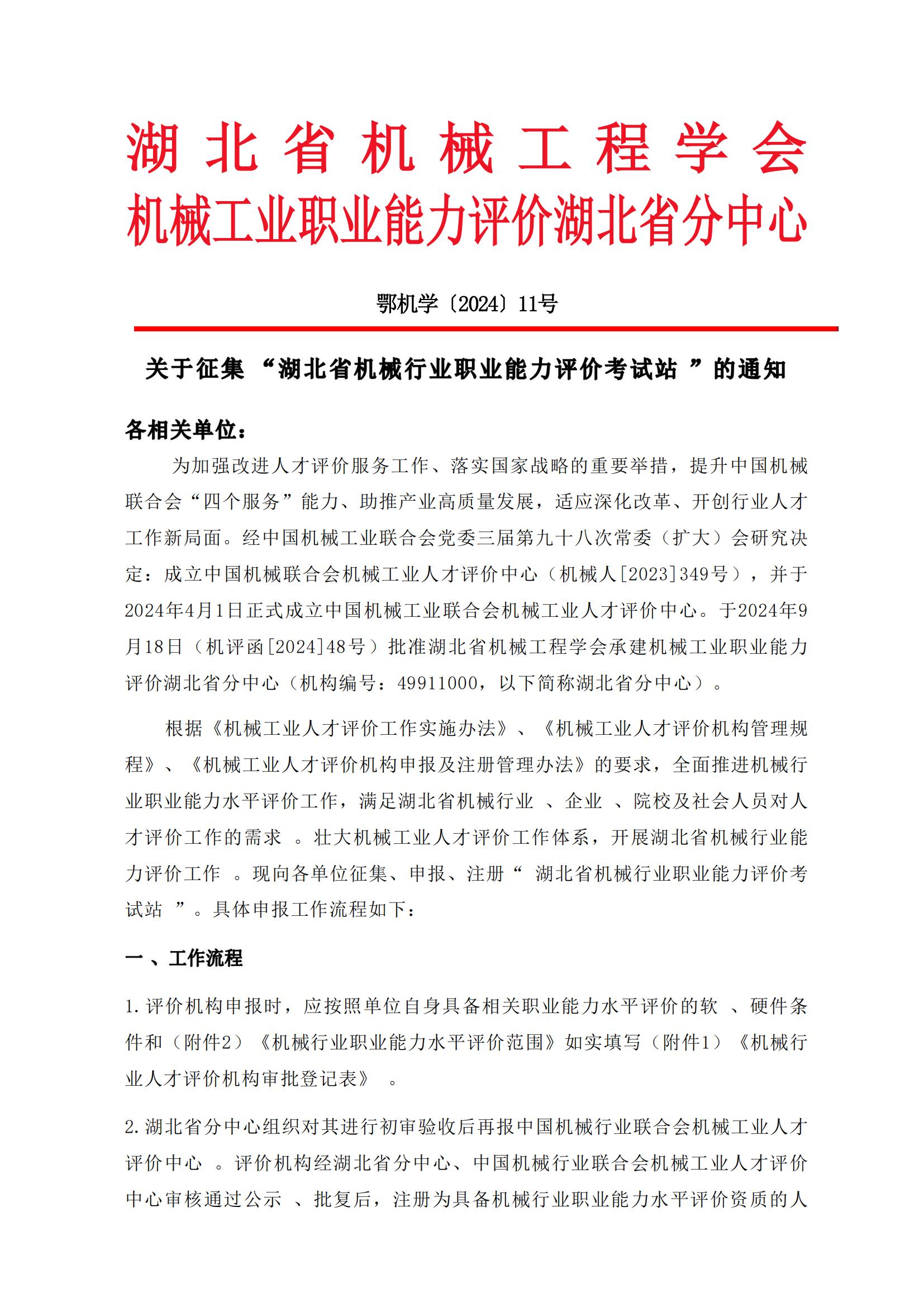 关于征集“湖北省机械行业职业能力评价考试站”的通知