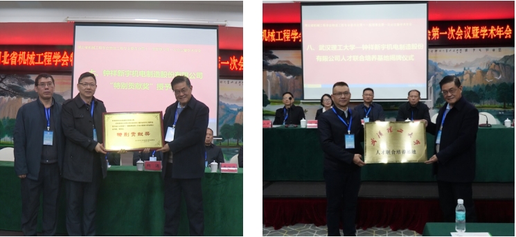 曹小华理事长代表物流工程专业委员会做了2024年度工作报告,报告中回顾了专委会2024年在理事会年会暨学术交流会、机械与物流工程研究生学术科技论坛、理事单位走访和技术探讨等方面的工作,同时就专委会下一年度的工作提出了期望。随后,为感谢钟祥新宇机电制造股份有限公司对本次提供的一流场所和服务,专委会理事长曹小华为其颁发了“特别贡献奖”。为了更好的促进产教融合,武汉理工大学和钟祥新宇机电制造股份有限公司共建了人才联合培养基地。