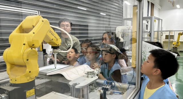 学生代表参观智能制造产线实验室,机器人写字演示与互动,近距离感受智能制造的魅力