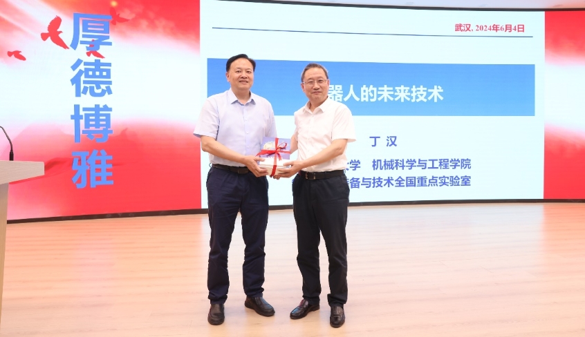丁汉院士以《机器人的未来技术》为题为300余名学生开讲。丁院士是我国著名的机器人与智能制造专家,任华中科技大学学术委员会主任、未来技术学院院长,国家数字化设计与制造创新中心主任,智能制造装备与技术全国重点实验室主任,国家自然科学基金重大研究计划“共融机器人的基础理论与关键技术研究”指导专家组组长和基础科学中心“机器人化智能制造”首席科学家。