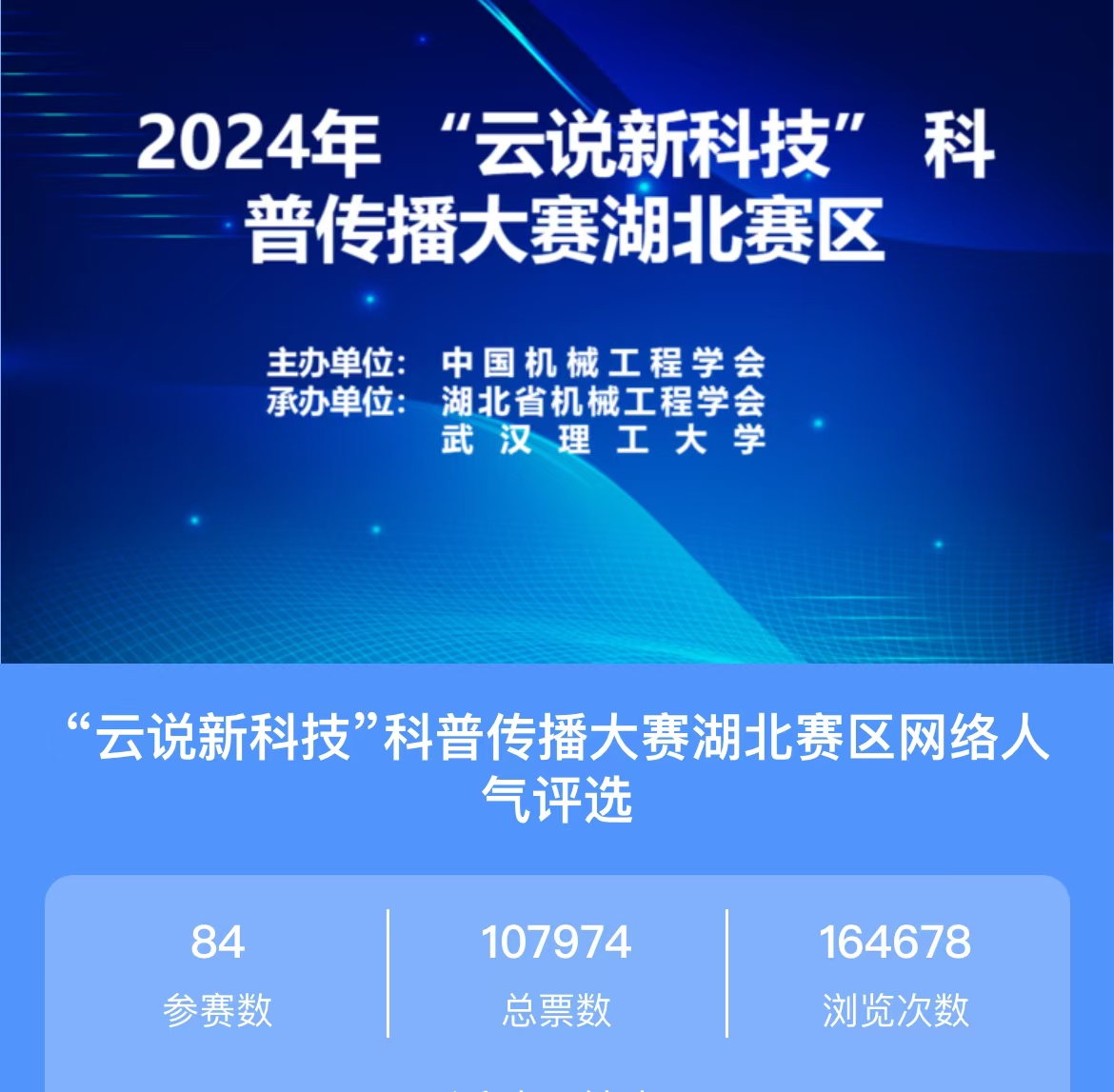 2024年“云说新科技”科普传播大赛全国总决赛由中国机械工程学会主办,湖北区域选拔赛由湖北省机械工程学会和武汉理工大学承办。