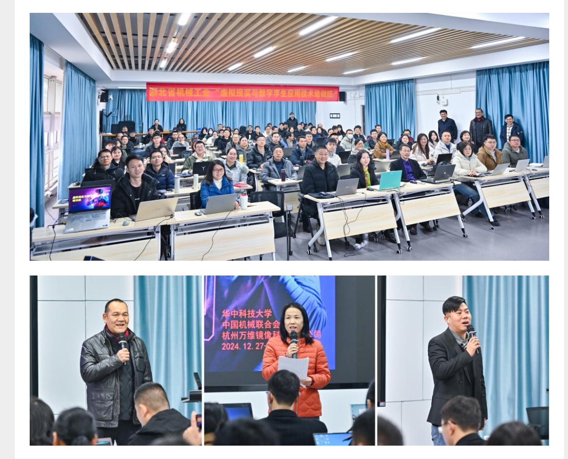 12月27日至29日,由湖北省机械工程学会、湖北省机械行业联合会指导,湖北省机械工业人才评价中心、湖北省机械工业人才评价工作专家委员会主办,华科大工程实践创新中心、机械学院,杭州万维镜像科技有限公司与武汉法博特机器人有限公司联合承办的湖北省机械工业“虚拟现实与数字孪生应用技术”培训班在我校工程实践创新中心顺利举办,此次培训吸引了来自全省机械工业领域的近100名专家参与,取得了丰硕成果,获得了一致好评,为推动湖北省机械工业数字化转型注入了新动力。