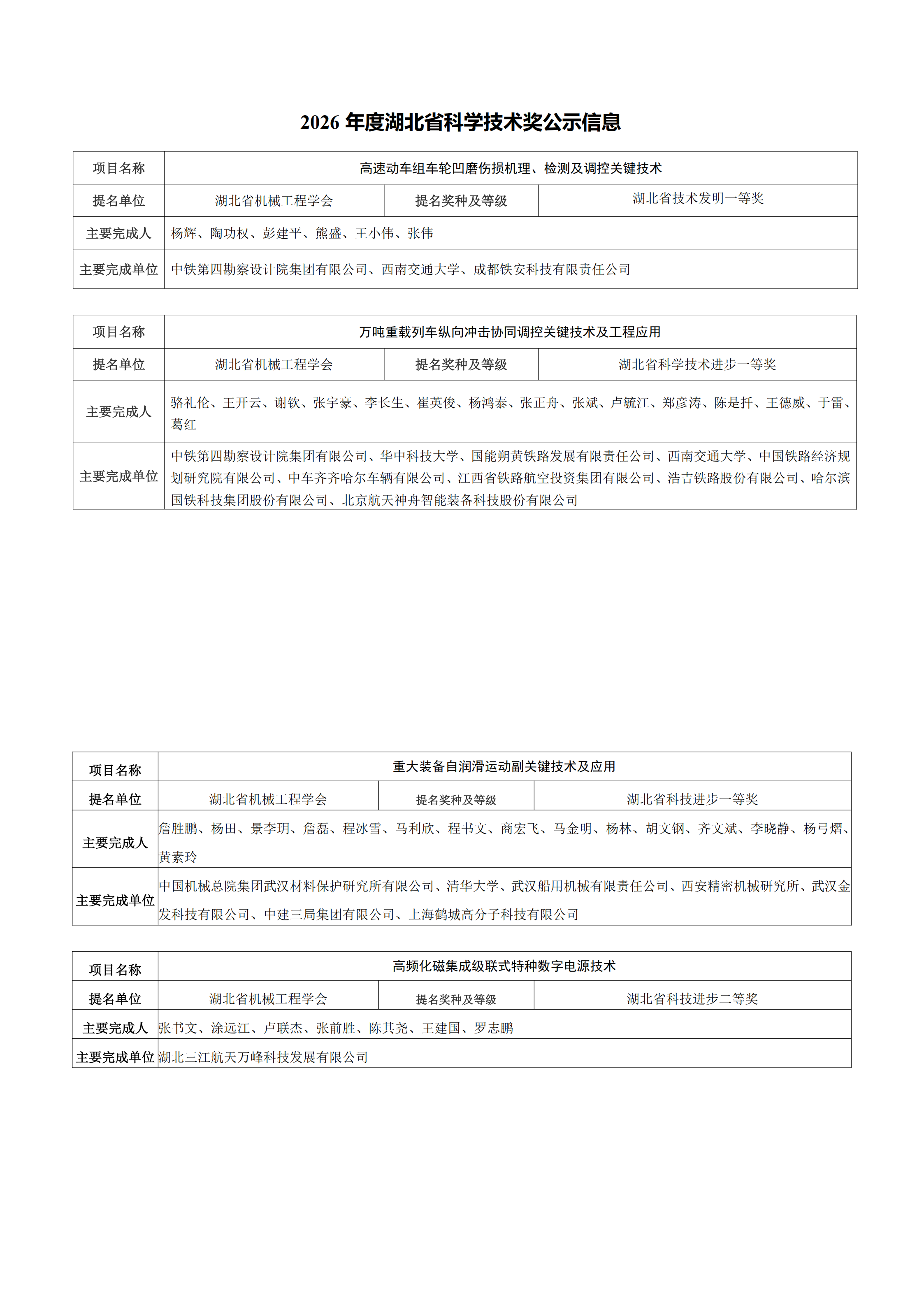 湖北省机械工程学会关于2026年度湖北省科学技术奖提名项目的公示